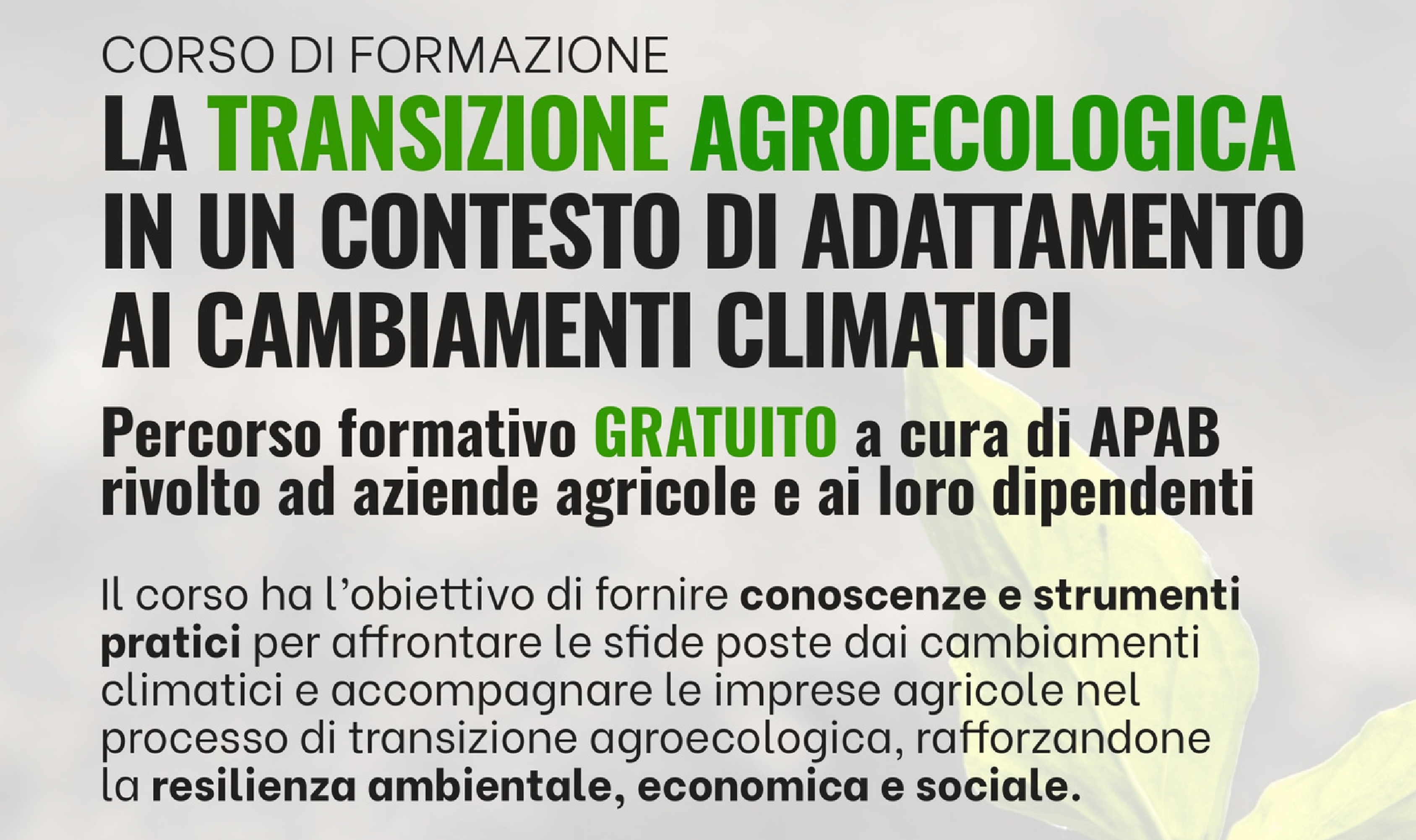 Rivolto alle aziende agricole e ai loro dipendenti, il corso ha l’obiettivo di fornire conoscenze e strumenti pratici per affrontare le sfide poste dai cambiamenti climatici e accompagnare le imprese agricole nel processo di transizione agroecologica, rafforzandone la resilienza ambientale, economica e sociale.